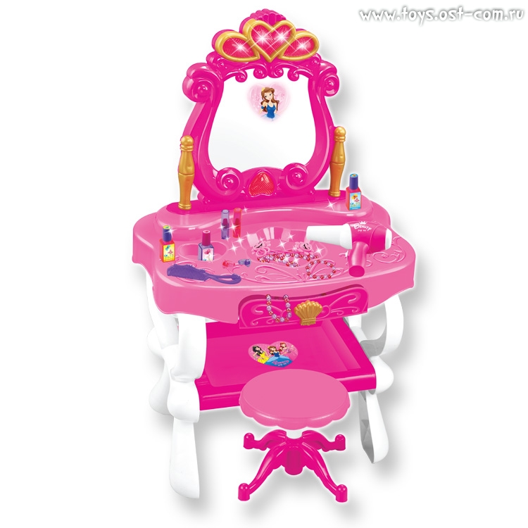Что может быть лучше, чем повертеться перед зеркалом, продумывая новый образ? С этим необычным набором каждая девочка почувствует себя сказочной красавицей! Махните рукой – в зеркале появляется прекрасная принцесса. При этом загораются и мигают декоративные элементы вокруг зеркала, играет приятная мелодия. Ящик в столе выдвигается – там можно хранить свои украшения.