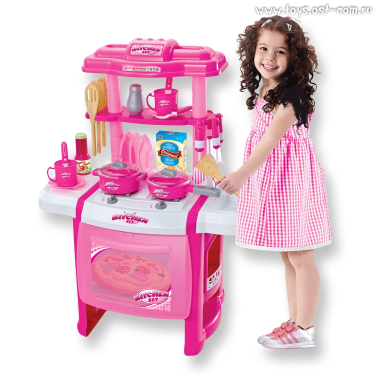 аждый ребёнок будет очень рад, когда увидит в своей комнате уменьшенную копию взрослой кухни. Конфорки светятся и издают звук приготовления пищи, включается таймер, духовка с открывающейся дверцей. Есть раковина, полки для посуды и приборов.