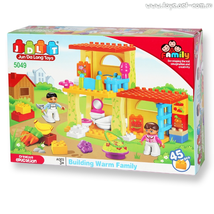 В комплекте: двухэтажное здание, морковь, бананы, лопата, фигурки людей, 45 деталей.