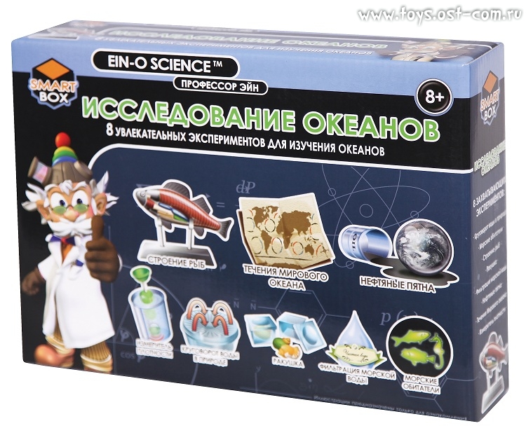 В наборе: инструкция на русском языке, контейнер для испарения, 2 стаканчика, палочка для перемешивания, пластилин, соломинка, карта океанов, контейнер, крышка, перышко, фигурки морских обитателей, пластмассовая модель рыбы, подставка, коробочка с увеличительным стеклом, раковина.