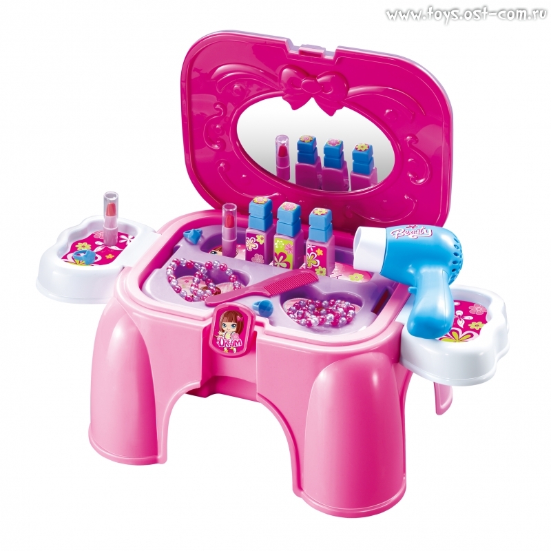Фен, который идёт в комплекте, работает как настоящий! Также в комплект входят 15 аксессуаров (лаки, помада, украшения) и красивые наклейки.