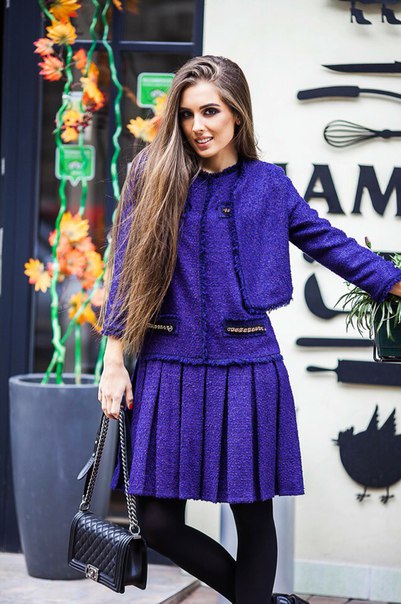 Поиск идеального классического костюма из твида завершен! Вот он - насыщенно синий цвет и оригинальный фасон. Укороченый пиджак на шелковой подкладке дополняет образ с платьем без рукавов. Платье приталенного кроя с плиссированной юбкой.
