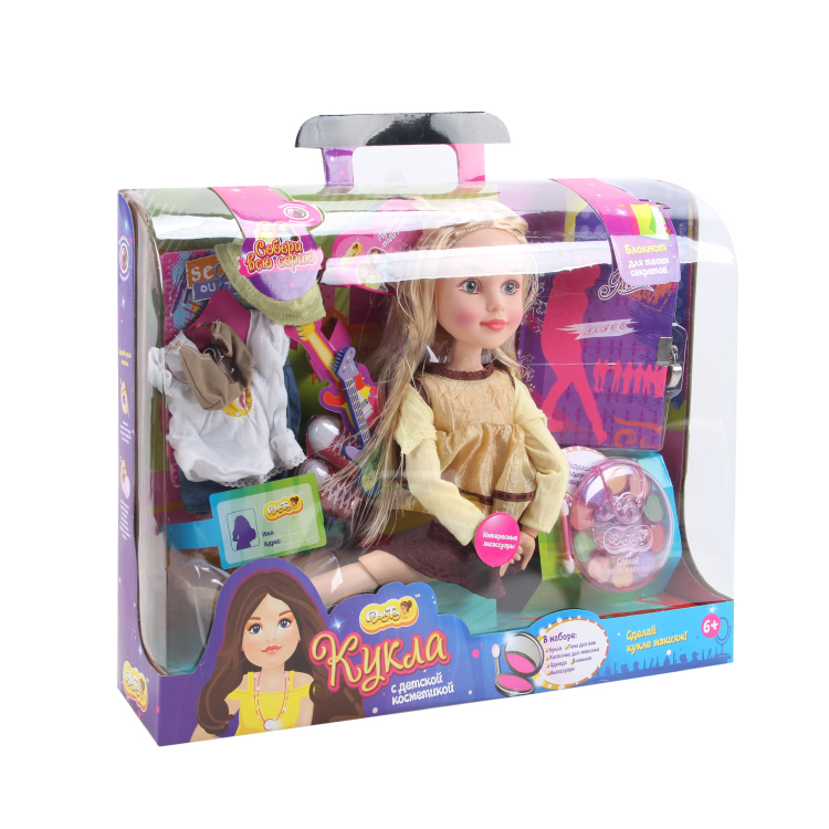 Материал: пластик, текстиль. Возраст ребёнка: от 3 до 6 лет. Рост куклы: 45,5 см. Размеры упаковки: 50 x 11 x 38 см. Упаковка: коробка-чемоданчик. В комплекте: кукла, косметика, одежда, блокнот.